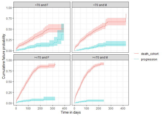 The package also allows to estimate survival of both an outcome and competing risk outcome together. We can then stratify, see information on events or summarise the estimates in the same way we did for the single event survival analysis.